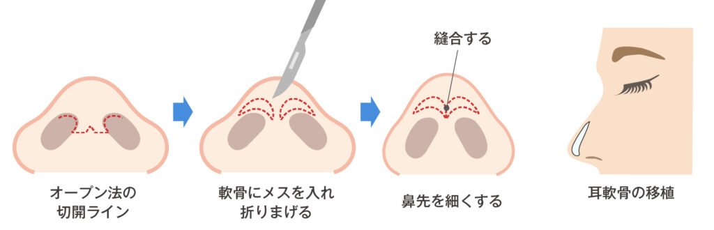 鼻尖を形作るポイントの軟骨を削ったり、不要な脂肪を除去することで鼻尖の形を整えます。