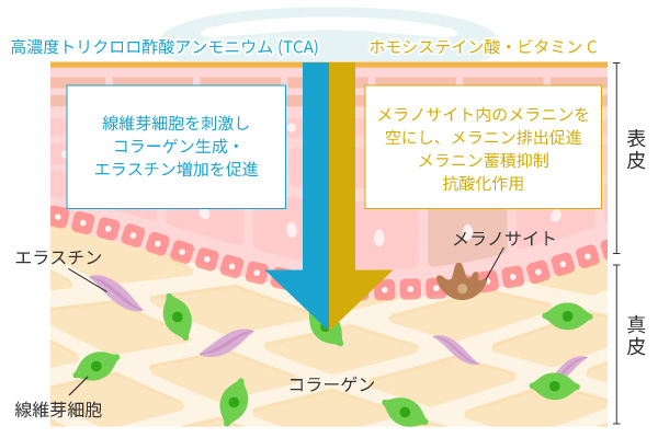 高濃度トリクロロ酢酸(TCA)と過酸化水素に加えてビタミンCやホモシステイン酸などの美白・抗酸化成分を配合しているのが特長です。コラーゲン生成によるハリ改善に加え、くすみや色ムラへのアプローチ、透明感の向上など、より総合的な美肌効果が期待できます。